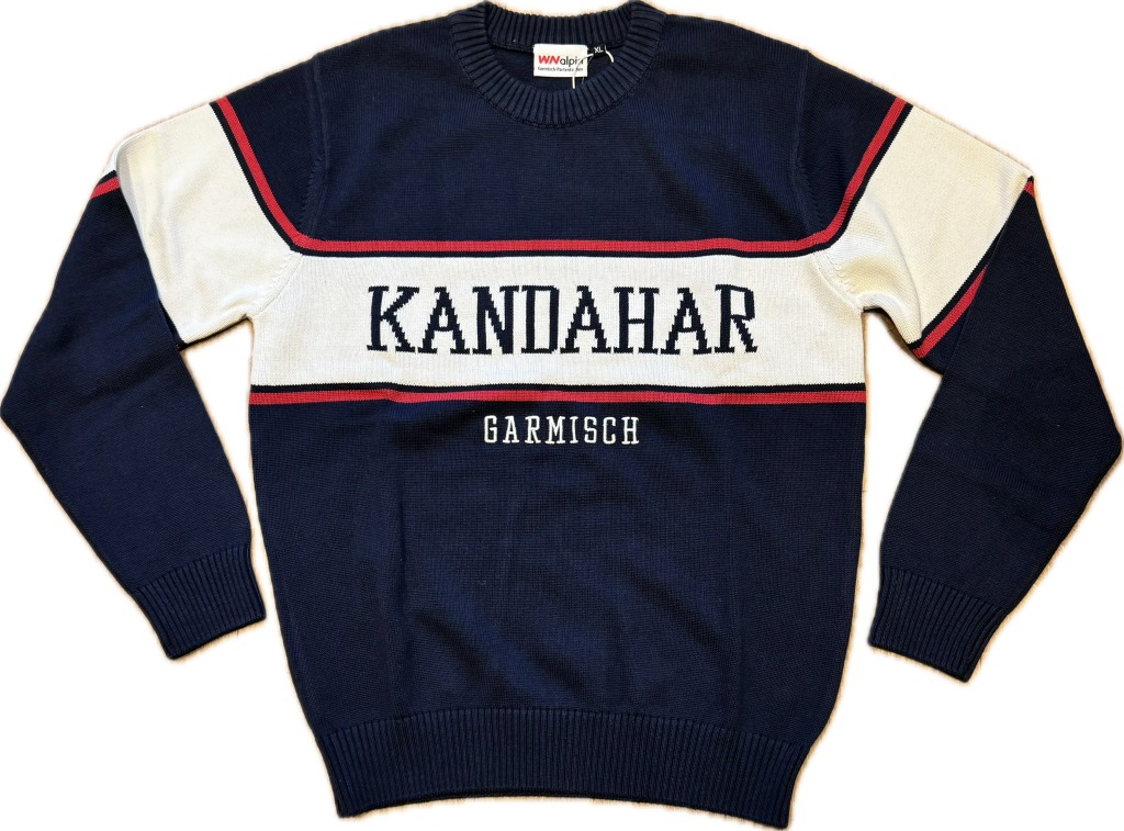 Der Kandahar Strickpullover vereint sportlichen Alpenstil mit klassischer Eleganz. Die markante Navy-Rot-Farbkombination erinnert an die dynamische Atmosphäre der berühmten Kandahar-Skipiste in Garmisch-Partenkirchen und verleiht dem Pullover einen frischen, aktiven Look.